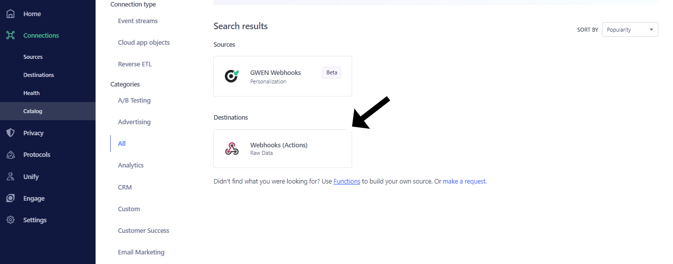 Log in to your Segment account, open workspace, and select source. Click on **Add Destination** and search and select [**Webhooks**](https://segment.com/docs/connections/destinations/catalog/webhooks/).&#x20;
