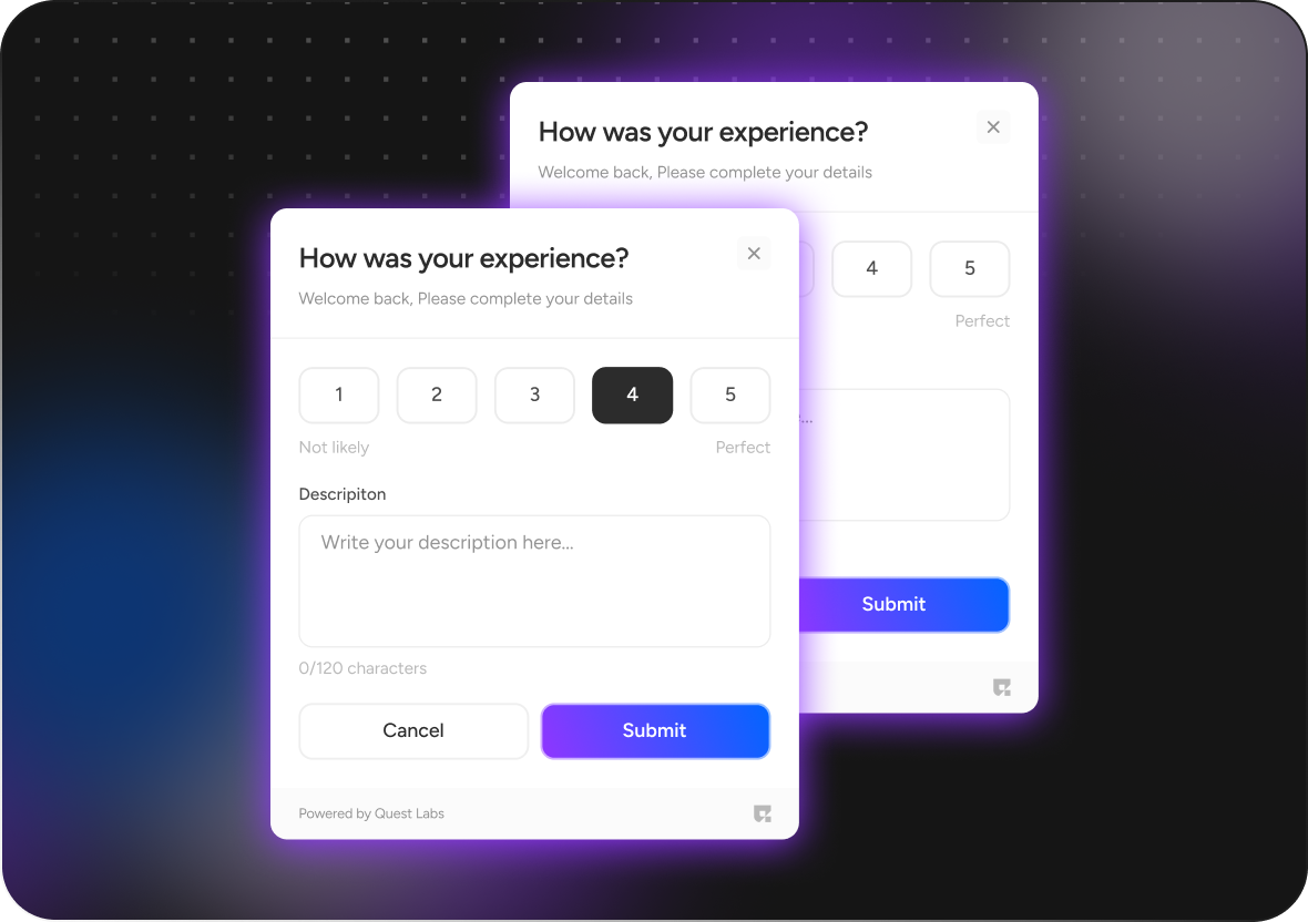<table><thead><tr><th width="170">Prop Name</th><th width="178">Type</th><th width="343">Description</th><th>Required</th></tr></thead><tbody><tr><td>questProvider</td><td>QuestProvider</td><td>Provides necessary configuration such as API key, entity ID, and optional theme settings</td><td>Yes</td></tr><tr><td>apiKey</td><td>String</td><td>API key to authenticate requests.</td><td>Yes</td></tr><tr><td>entityId</td><td>String</td><td>Entity ID associated with the quest.</td><td>Yes</td></tr><tr><td>themeConfig</td><td>QuestThemeConfig</td><td>Customizes theme settings like background color, font style, border color, button color, etc.</td><td>No</td></tr><tr><td>primaryColor</td><td>Color</td><td>Sets the primary color of the component .</td><td>no</td></tr><tr><td>secondaryColor</td><td>Color</td><td>Sets the secondary color of the component .</td><td>no</td></tr><tr><td>buttonColor</td><td>Color</td><td>Defines the color of buttons within the component .</td><td>no</td></tr><tr><td>backgroundColor</td><td>Color</td><td>Specifies the background color of the component .</td><td>no</td></tr><tr><td>borderColor</td><td>Color</td><td>Defines the color of the component's border.</td><td>no</td></tr><tr><td>fontStyle</td><td>String</td><td>Sets the font style for text within the component (e.g., <code>"poppins"</code>)</td><td>no</td></tr><tr><td>surveyProps</td><td>SurveyProps</td><td>Contains user ID, campaign ID, token, and display options for the "Tutorial Component" </td><td>Yes</td></tr><tr><td>userId</td><td>String</td><td>Unique user identifier.</td><td>Yes</td></tr><tr><td>token</td><td>String</td><td>Token for authenticating the user session.</td><td>Yes</td></tr><tr><td>campaignId</td><td>String</td><td>Unique campaign identifier.</td><td>Yes</td></tr><tr><td>showFooter</td><td>bool</td><td>Whether or not to display the footer in the "Survey" component.</td><td>no</td></tr><tr><td>uiHeader</td><td>List&#x3C;UiHeader></td><td>change question section header and description </td><td>no</td></tr><tr><td>heading</td><td>String</td><td>Sets the text for the heading area of the component</td><td>no</td></tr><tr><td>subHeading</td><td>String</td><td>Provides text for the description area of the component</td><td>no</td></tr><tr><td>questionSection</td><td>List&#x3C;List&#x3C;int>></td><td>change your question order and question section</td><td>no</td></tr></tbody></table>
